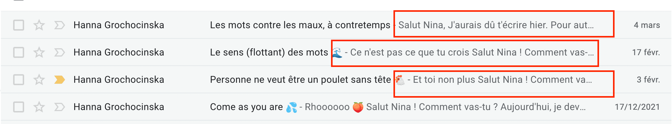 Lorsqu’on vous envoie un e-mail, vous avez l’aperçu des premières lignes juste après l’objet. C’est l’opportunité de créer de la curiosité et d’ajouter des éléments de personnalisation dès la première phrase.