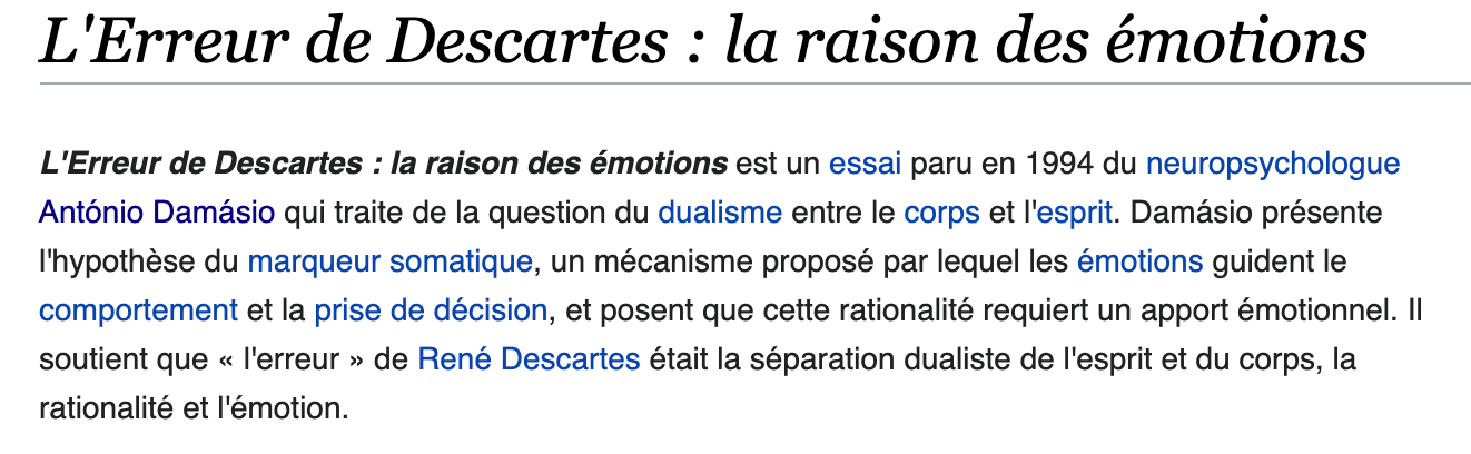 La conclusion donnée par L’Erreur de Descartes de Antonio Damasio en 1994 est que les émotions dictent une grande partie de nos comportements. À l’époque, c’est une thèse surprenante pour les neurosciences.